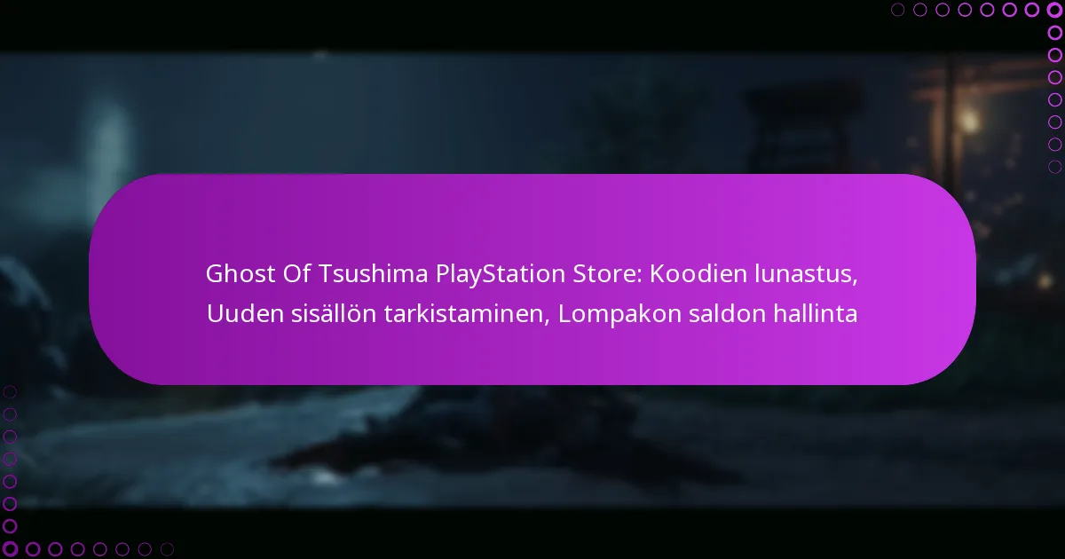 Parantaaksesi kokemustasi Ghost of Tsushima -pelissä, voit helposti lunastaa koodeja PlayStation Storessa pääsemällä siihen konsolisi tai verkkoselaimesi kautta. Uuden sisällön seuraaminen on tärkeää, joten tarkista säännöllisesti kauppa uusimpien laajennusten ja päivitysten varalta. Lisäksi lompakkosi saldon hallinta varmistaa sujuvat tapahtumat ja mahdollistaa pelihankintojesi maksimoimisen.